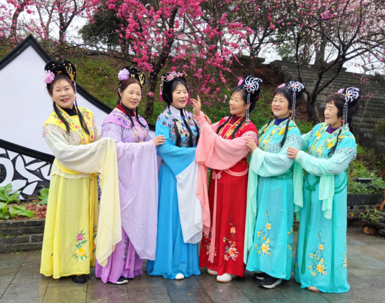 南屏村地处新安江畔,古巷青砖与沿江桃花相映成趣,学员们漫步在春日美景中,一边欣赏徽州古村落的人文底蕴,一边交流黄梅戏的唱腔与身段。大家换上色彩鲜亮的戏服,梳起精致的戏曲头饰,在桃花树下、粉墙黛瓦间留下了一张张充满活力的合影,婉转的唱腔与爽朗的笑声回荡在古村的街巷里。